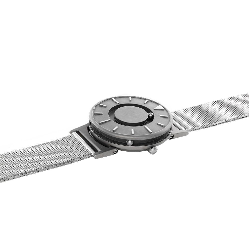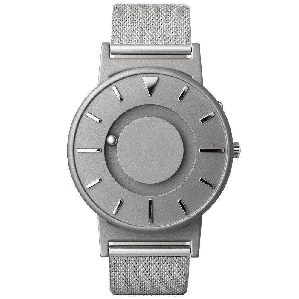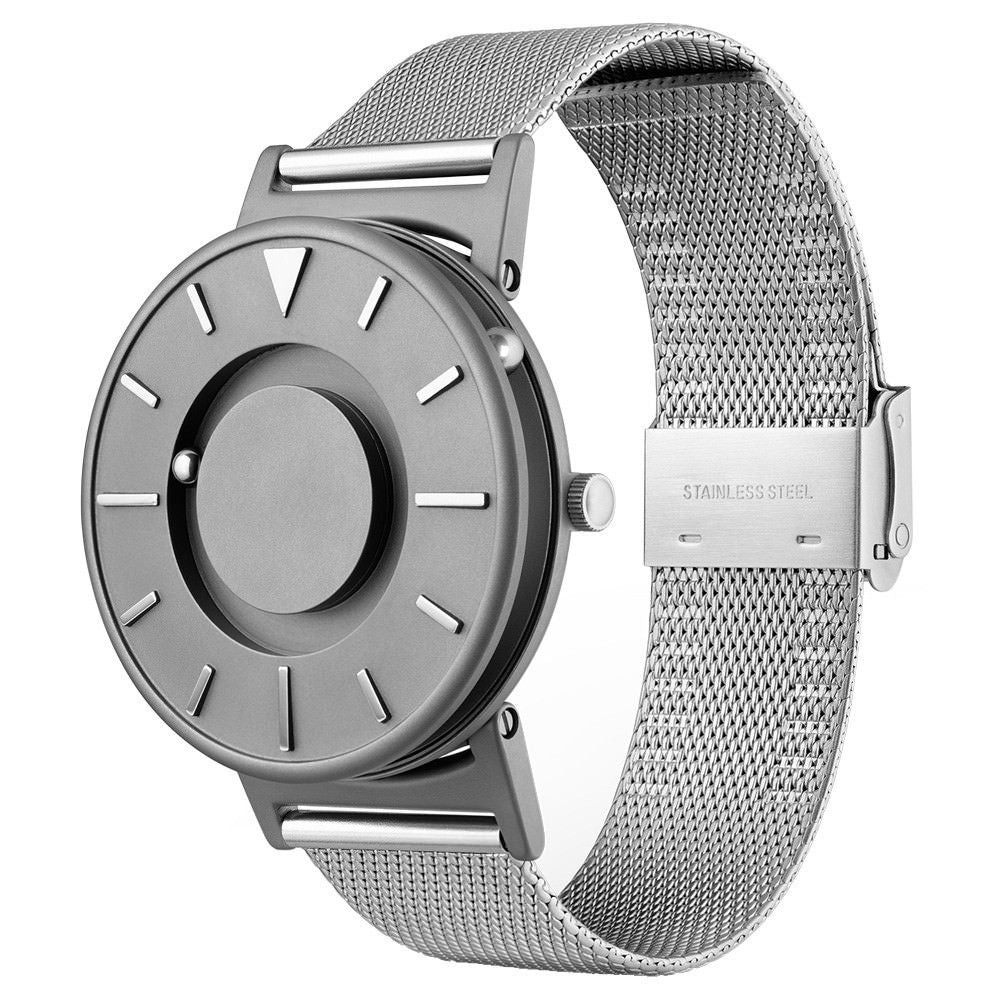 Tell time by touch with raised markers and two ball bearings that travel around the watch and face in separate, recessed tracks: one for the minute, and one for the hour.